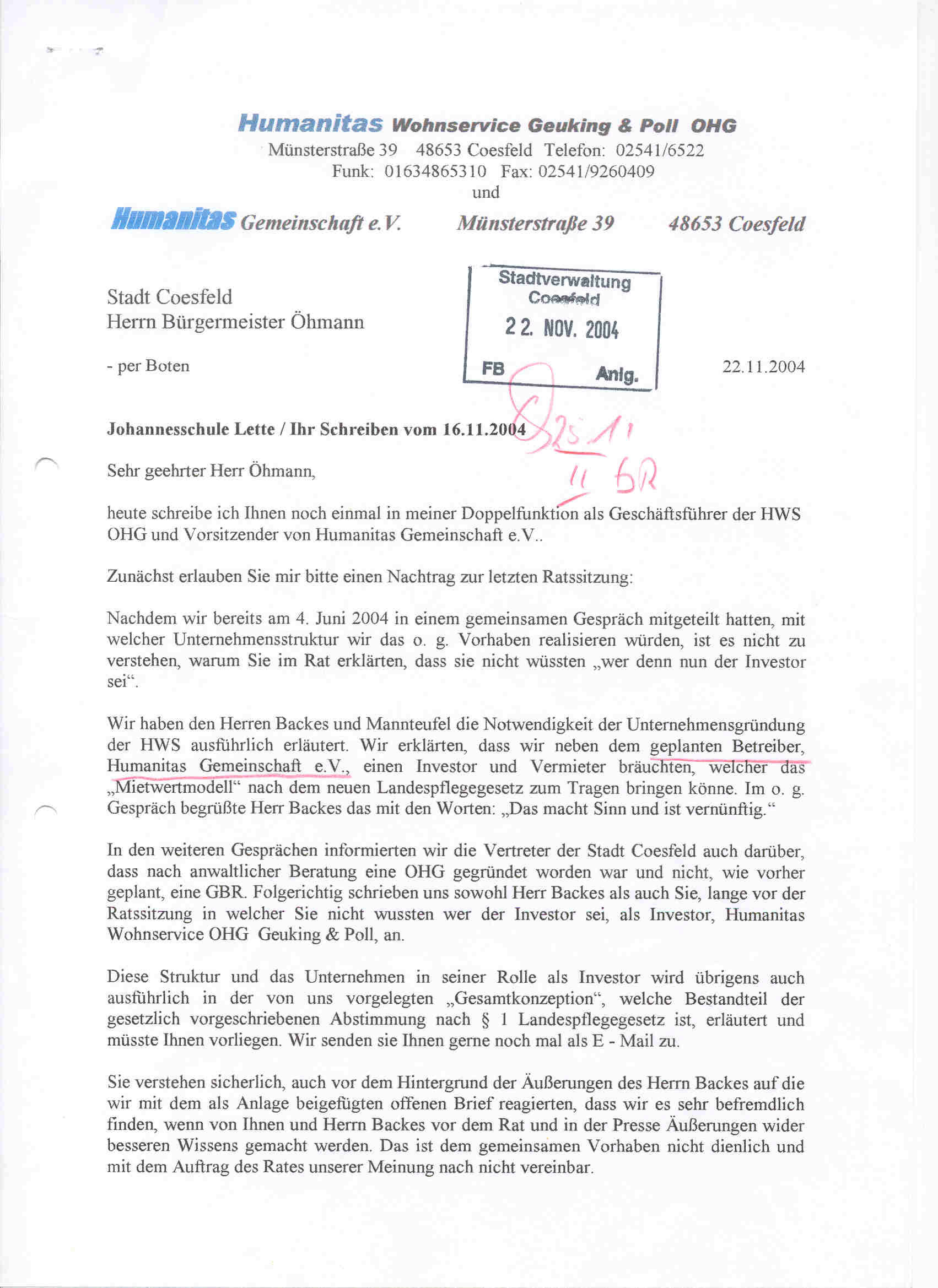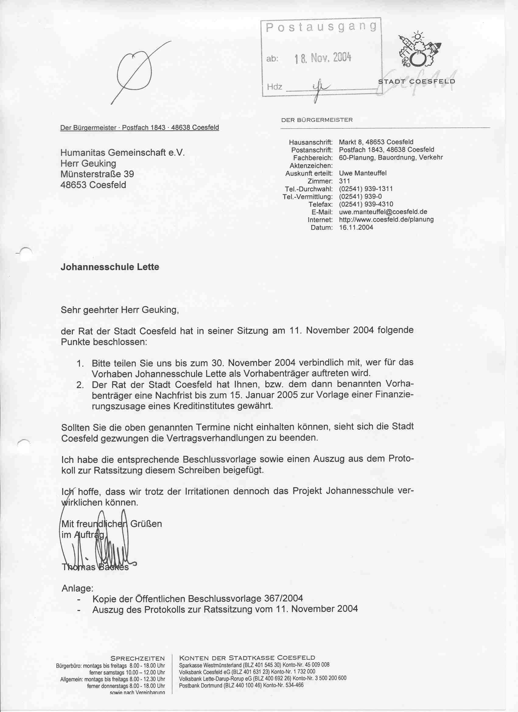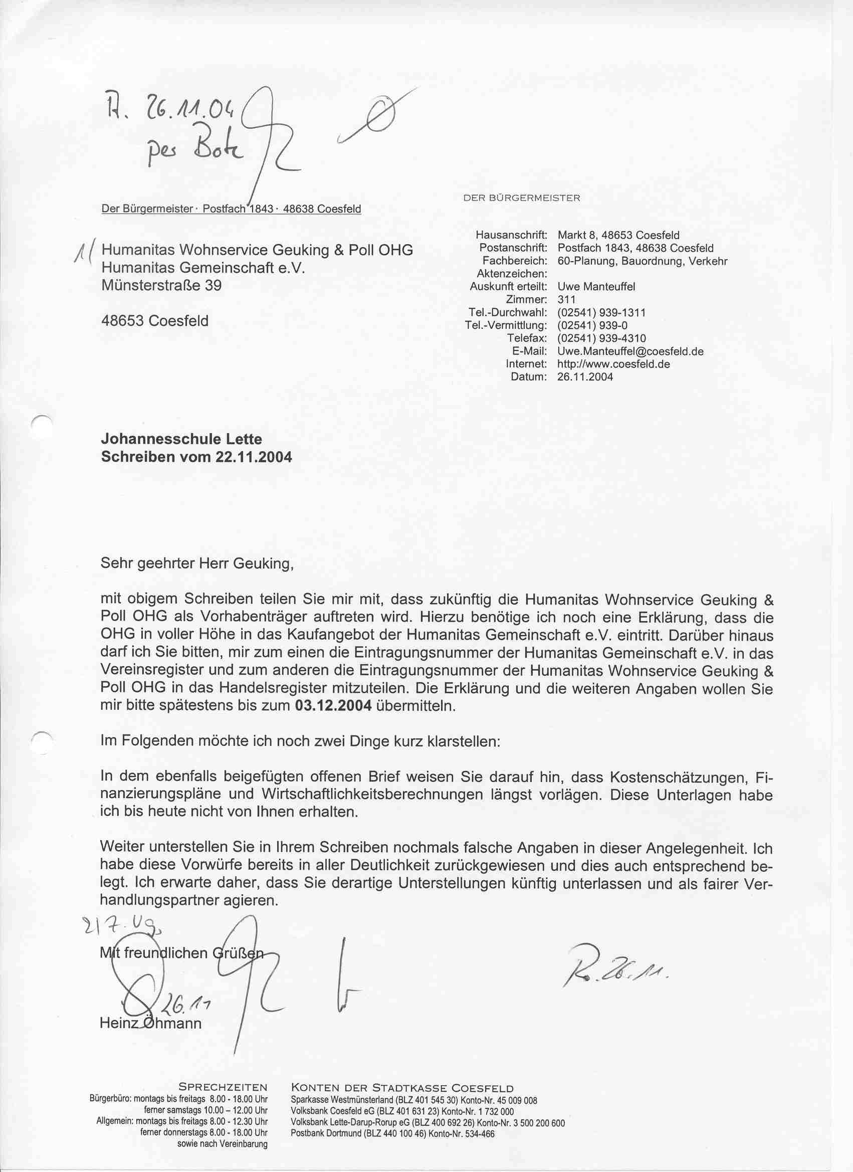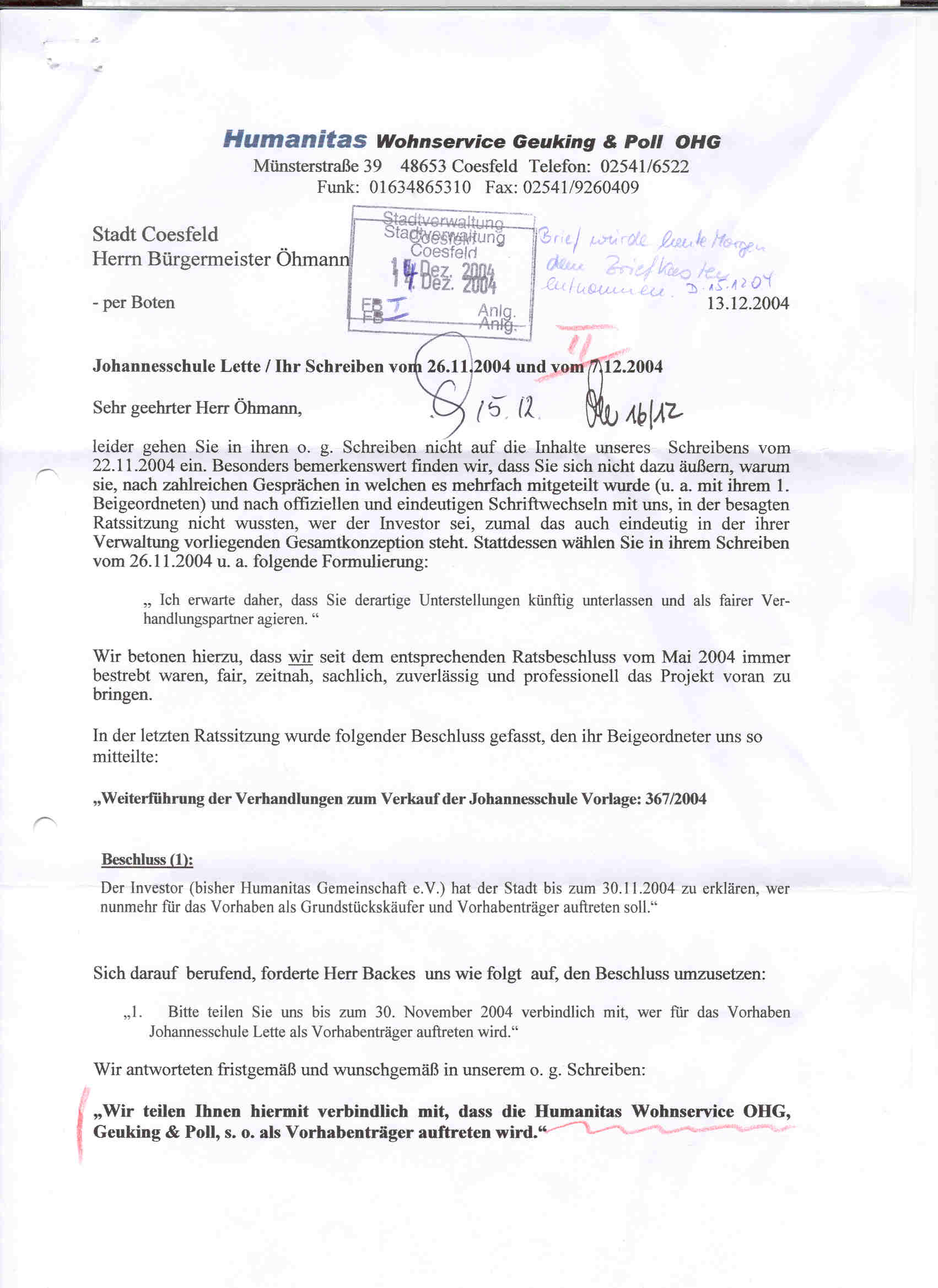 | Ö 6 | Verhandlungen zum Verkauf der Johannesschule in Lette