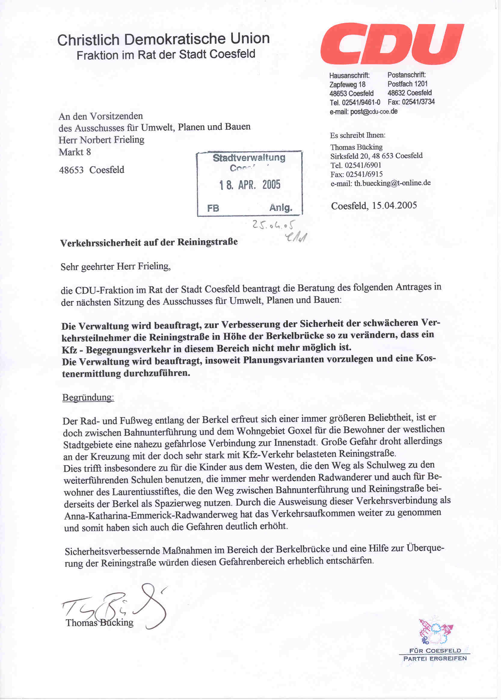 Antrag der CDU-Fraktion: Verkehrssicherheit auf der Reiningstraße